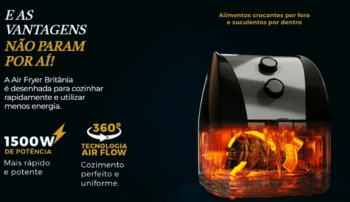 A Air Fryer Britânia BFR51 possui 1500W de potência. Além disso, conta com tecnologia Air Flow, que distribui o ar quente em 360°.