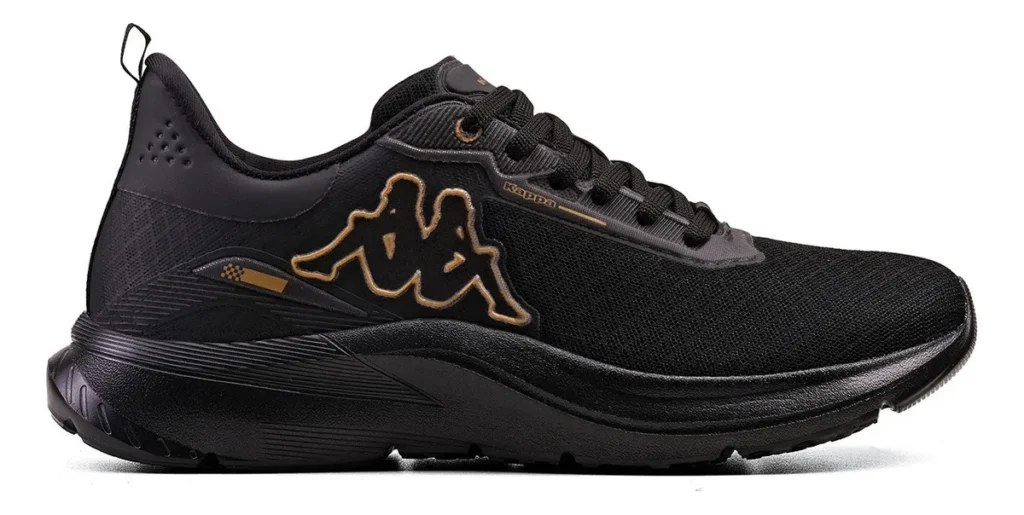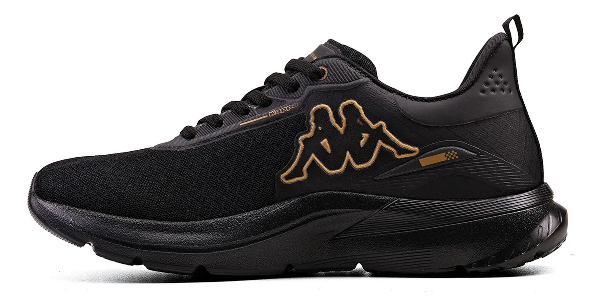 O Kappa Park 2.0 apresenta um design minimalista e moderno. O modelo da foto, em preto com detalhes em dourado (o famoso logotipo Omini da Kappa), traz uma sofisticação que permite transitar entre a academia e um evento casual.
